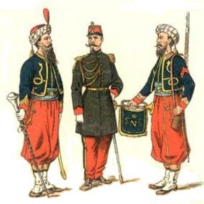 élémets fondamentaux de l’uniforme de Zouaves : la chéchia qu’il pouvait être enceinte de turban, la courte veste ouverte (shama), le gilet