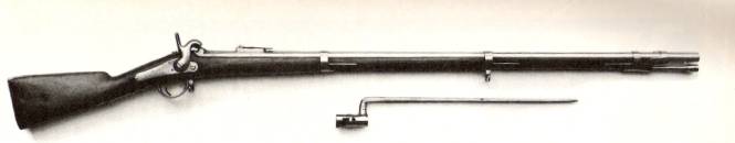 caliber 17,6 milimeters, length 96,5 cm, weight Kg. 2,55. The arm is born like transformation of model 1829 to flint. Beginning from the 1849 were introduced increased barrel to the aim of the assembly of the bayonets mod. 1842 and with the presence of the nail on the bottom of the combustion chamber, Thouvenin’s system. Beginning from the 1856 the nail was eliminated thus being able to be used the bullet of the Minié’s system. Octagonal barrel in breech for 15/45 milimeters, reduced, round for the rest. Threading to 4 right-handed flat lines, step milimeters 1.100. Flown fixed view-finder in, heel of sight on fixed hoof with adjustable cursor till 600 m. Slab to motivating force ahead, long milimeters 130. Sabre bayonet with yatagan blade model 1842. Length of the blade milimeters 575x33; total milimeters 675. Blade to a thread, with tip and fort back, rabbet centers them long milimeters 425. Guard in iron with ring for the barrel. Grip, in brass, to spout with 15 rabbets of taken and to longitudinal rabbet on the back for the implantation. Button with motivating force for the release.